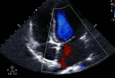Exame por ultrassom que mostra o funcionamento e estruturas do coração.